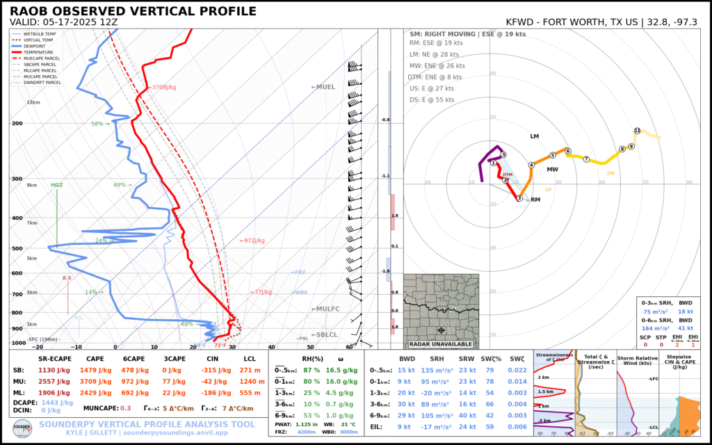 Shreveport morning sounding showed a very moist atmosphere with a PWAT value of over 2″. Norman was north of the boundary, which was very dry. A steady stream of westerlies in the upper levels would ensure decent venting.