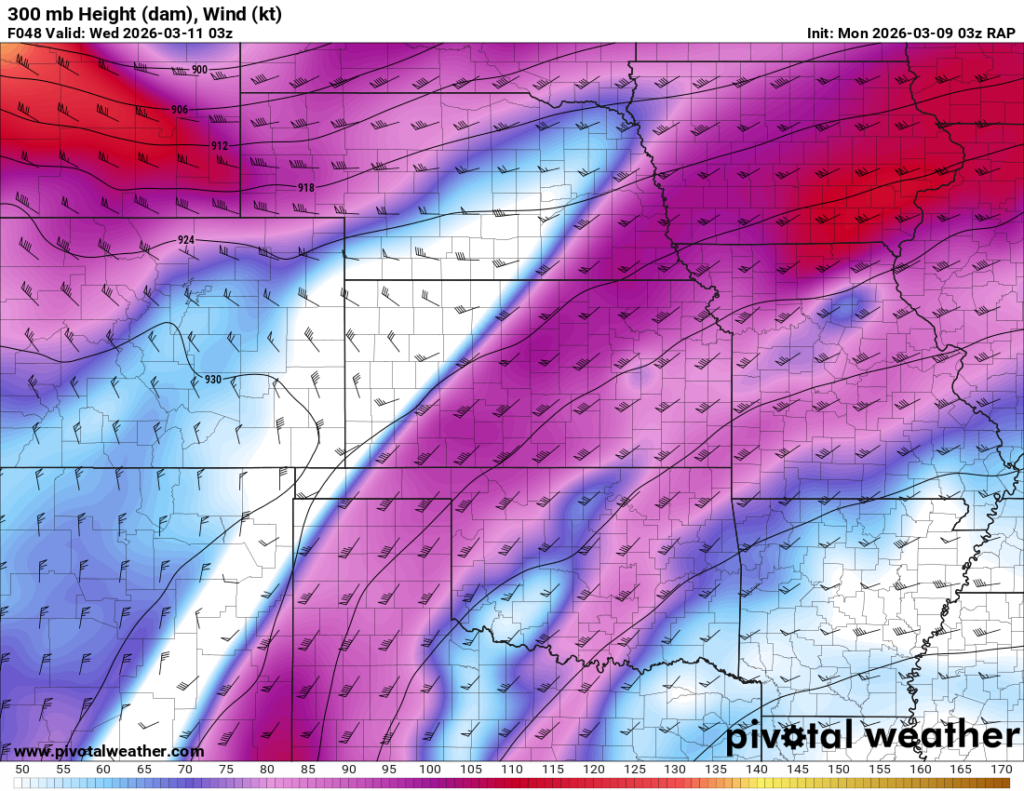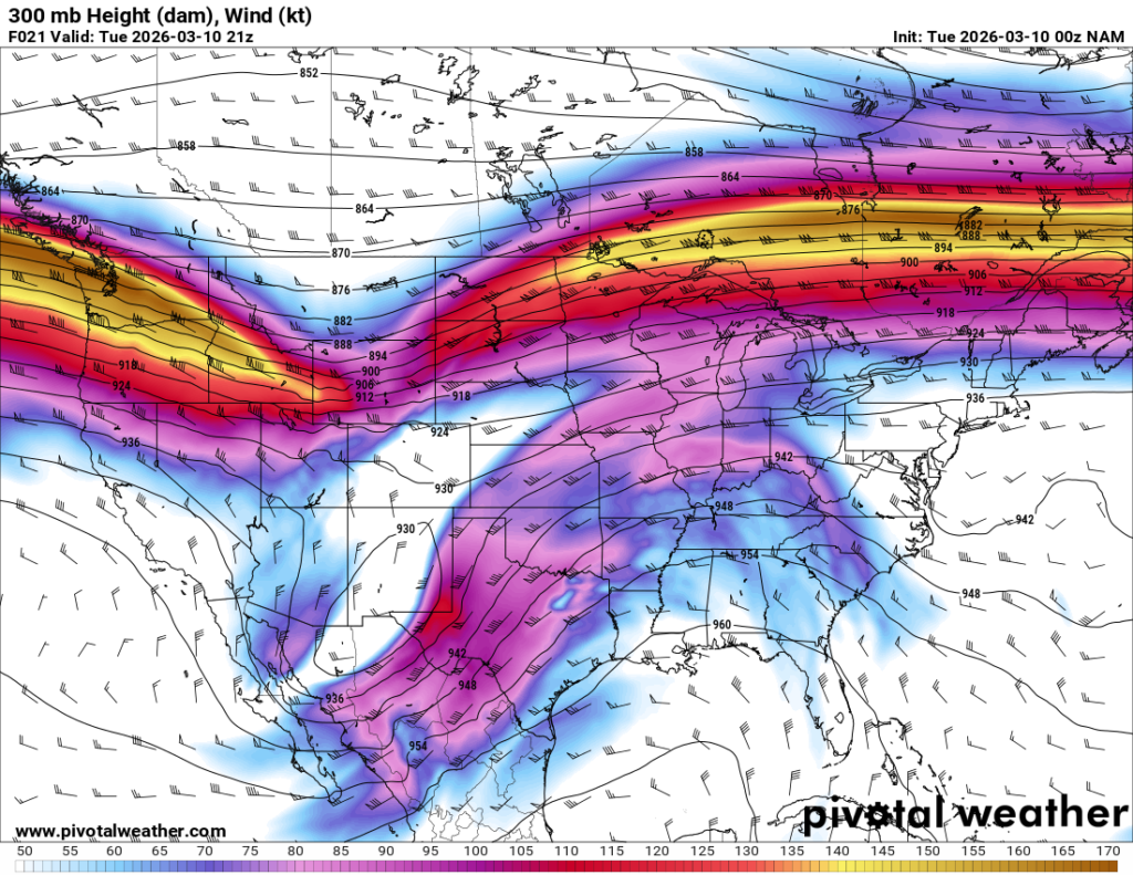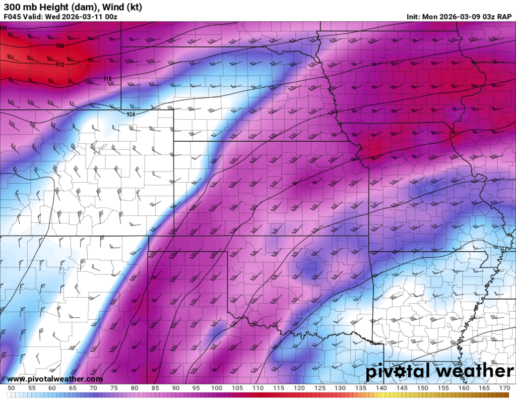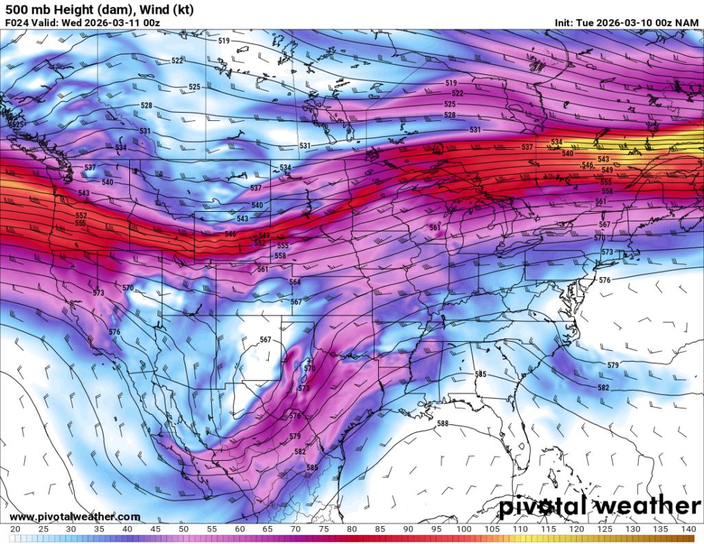 Looking out 2 full days, the evening RAP run on Saturday night March 7th (03Z on March 8) was showing the possibility of supercells in Central and Southern Oklahoma. With the main jet stream staying north, a cut off low over Northern Mexico and ejecting into Texas/Oklahoma in the late afternoon and evening hours. With the success I had with cutoff lows in 2012, I couldn’t ignore this system in the Southern Plains.