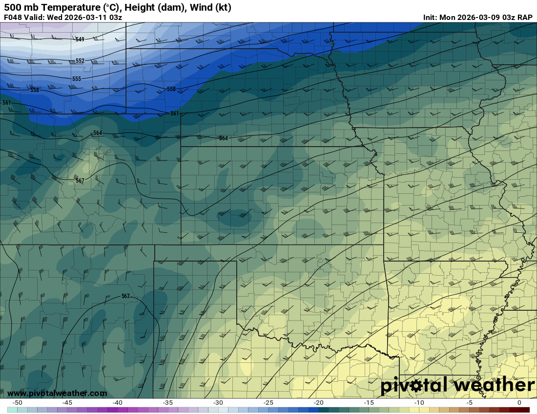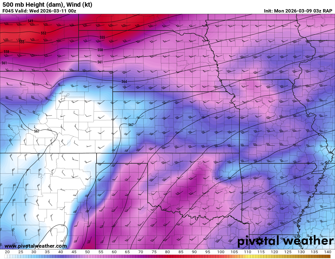 Looking out 2 full days, the evening RAP run on Saturday night March 7th (03Z on March 8) was showing the possibility of supercells in Central and Southern Oklahoma. With the main jet stream staying north, a cut off low over Northern Mexico and ejecting into Texas/Oklahoma in the late afternoon and evening hours. With the success I had with cutoff lows in 2012, I couldn’t ignore this system in the Southern Plains.