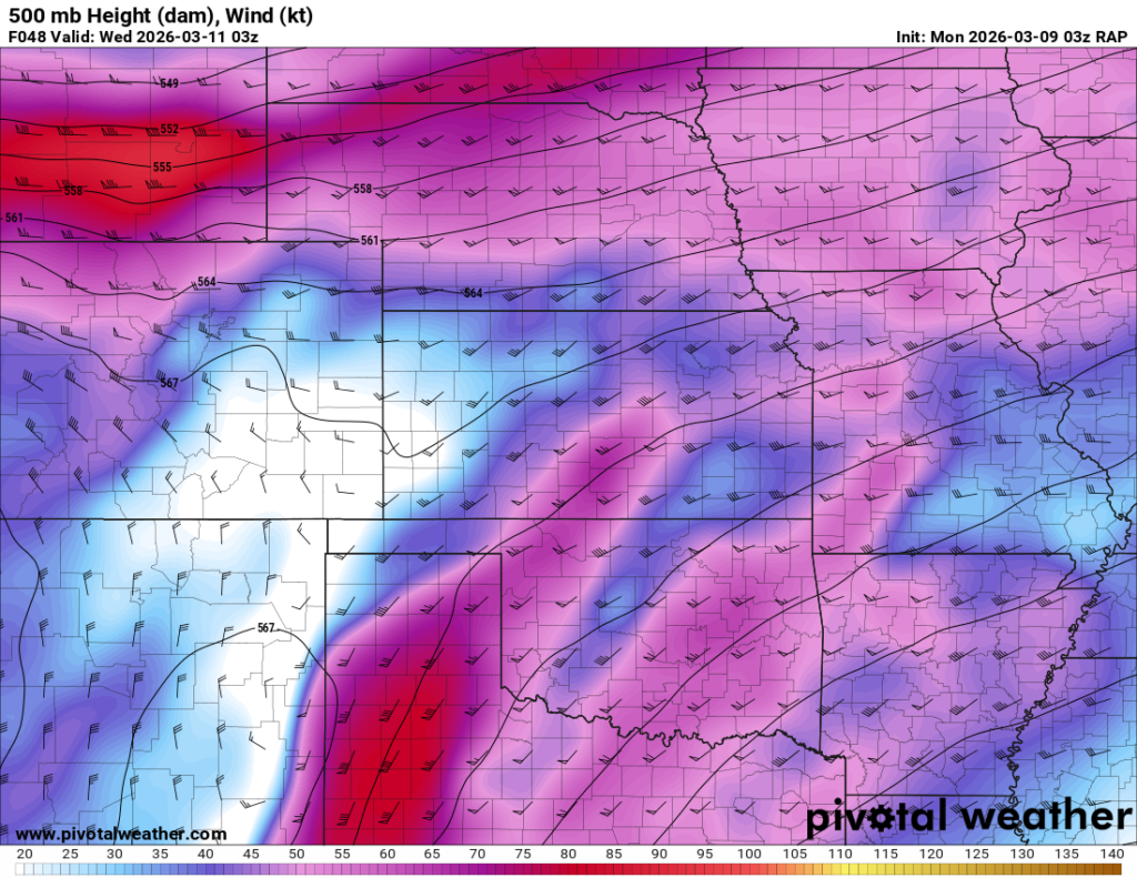 Looking out 2 full days, the evening RAP run on Saturday night March 7th (03Z on March 8) was showing the possibility of supercells in Central and Southern Oklahoma. With the main jet stream staying north, a cut off low over Northern Mexico and ejecting into Texas/Oklahoma in the late afternoon and evening hours. With the success I had with cutoff lows in 2012, I couldn’t ignore this system in the Southern Plains.